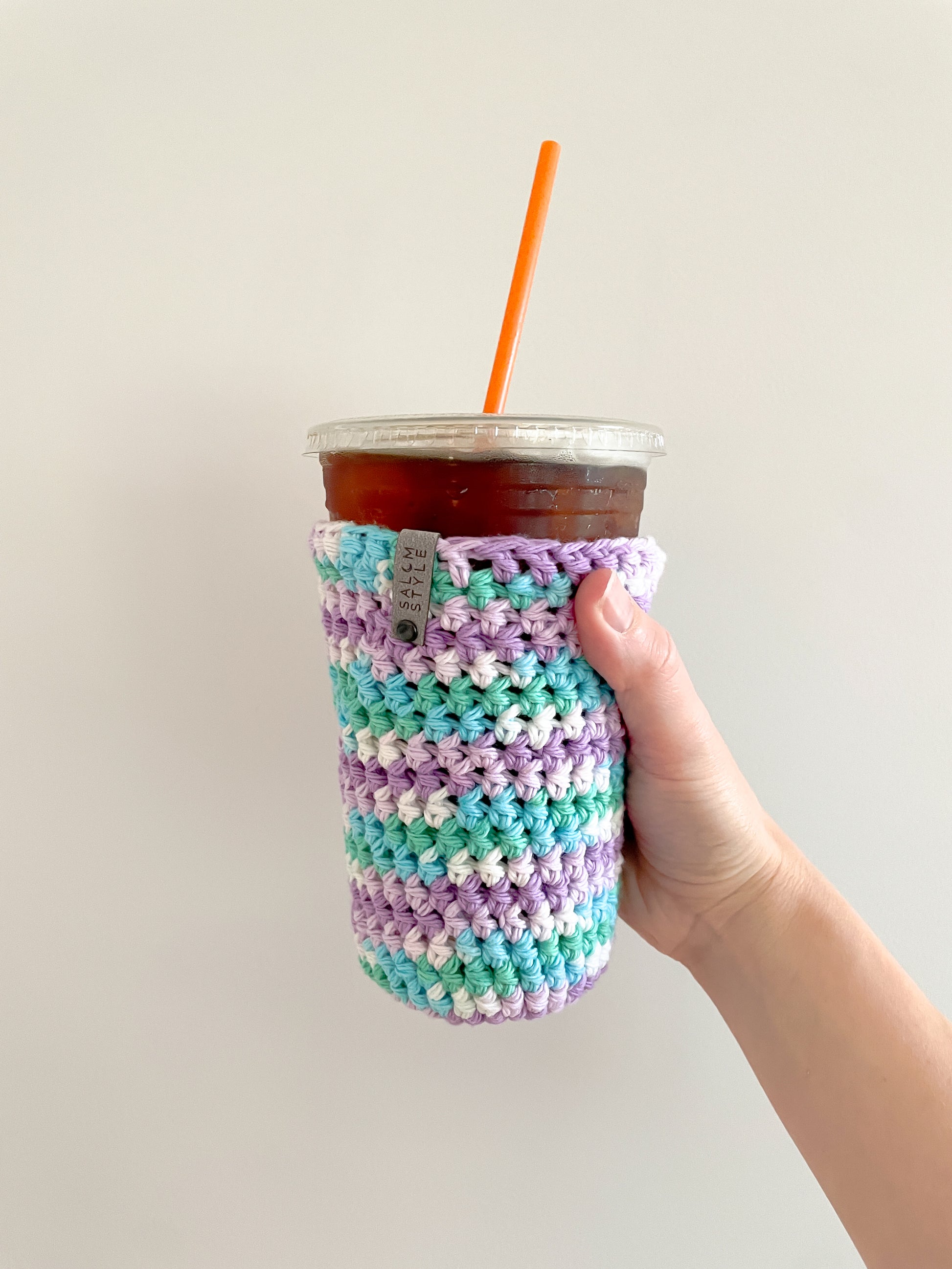 Crocheted with soft, breathable cotton and sized for a standard medium iced coffee (24 oz).